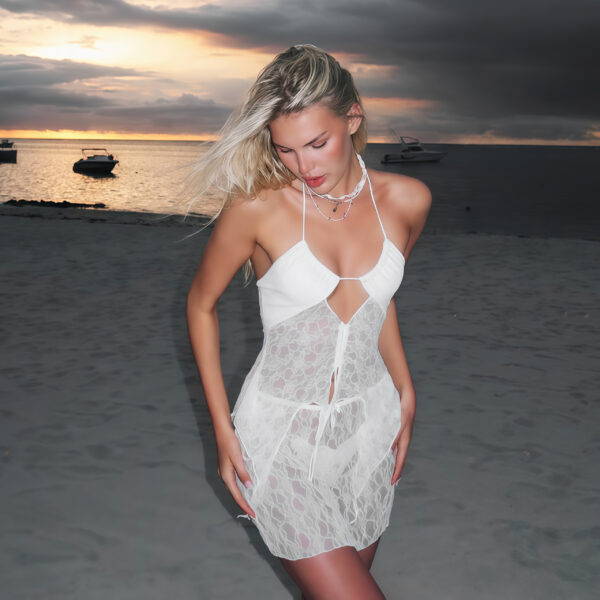 Løft din garderobe med denne fængslende hvid festminikjole med blonder til kvinderDen har et rent blondeovertræk, et vovet cut-out-design og en flirtende flæsekant. Denne kjole er ideel til strandture, sommersoiréer eller intime aftener. hvid festminikjole med blonder til kvinder kombinerer delikat udstråling med moderne flair og passer perfekt til modetrends i 2025.