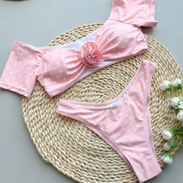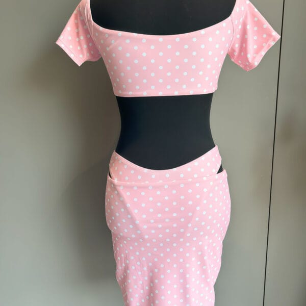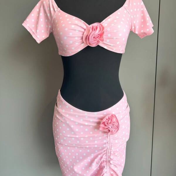 • Legende polkaprikket design: Den lyserødt polkaprikket mønster tilføjer et finurligt præg, suppleret af delikate blomsterdetaljer på både Top uden skuldre og Mini nederdelog skaber et sammenhængende og trendy look.
