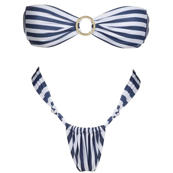 Peppen Sie Ihre Bademodenkollektion mit dieser atemberaubenden blau-weiß gestreiftes Bikini-SetDie "Cinémathèque" wurde für modebewusste Frauen entworfen, die am Pool oder am Meer gerne ein Zeichen setzen. Gefertigt aus hochwertigen Materialien, ist dieses Gestreifter Badeanzug für Frauen bietet ein schickes trägerloses Bandeau-Oberteil mit einem trendigen, runden Ring-Detail, das sowohl Stil als auch Halt bietet. Das passende gestreifter Bikiniunterteil hat eine bequeme Passform mit verstellbaren Seitenbändern, die allen Körpertypen schmeichelt. Perfekt für Sommerurlaube, Strandpartys oder einen entspannten Tag am Meer ist dieses Bikiniset für Frauen verbindet Eleganz und Funktionalität.