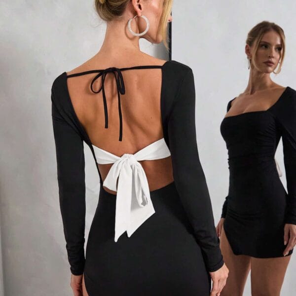 Entfesseln Sie Ihr inneres Selbstvertrauen mit unserem Schwarzes Bodycon-Kleid mit quadratischem Ausschnitt für Frauenist eine elegante und stilvolle Ergänzung für jede Garderobe. Gefertigt aus einem dehnbaren Polyester-Elasthan-GemischDieses figurbetonte Kleid ist mit einem auffälligen quadratischer Ausschnitt und lange Ärmelakzentuiert durch eine schicke rückseitig offenes Design und einem zarten Krawatten-Detail. Die Mini-Länge und die figurbetonte Silhouette machen es perfekt für Partys, Ausgehen oder besondere Anlässe.