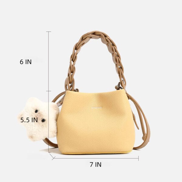 Crafted from premium PU leather, this yellow tote handbag ensures durability and a soft, luxurious feel. The braided handle and lightweight construction enhance comfort, while the sturdy stitching and plush charm provide long-lasting style and appeal.