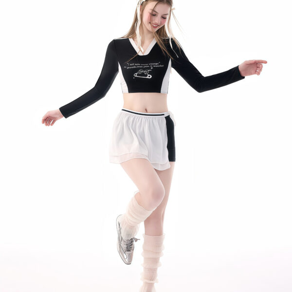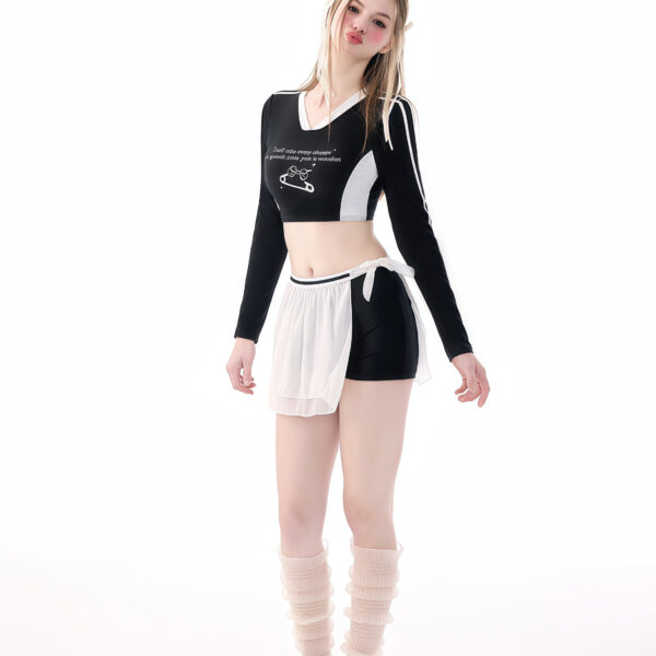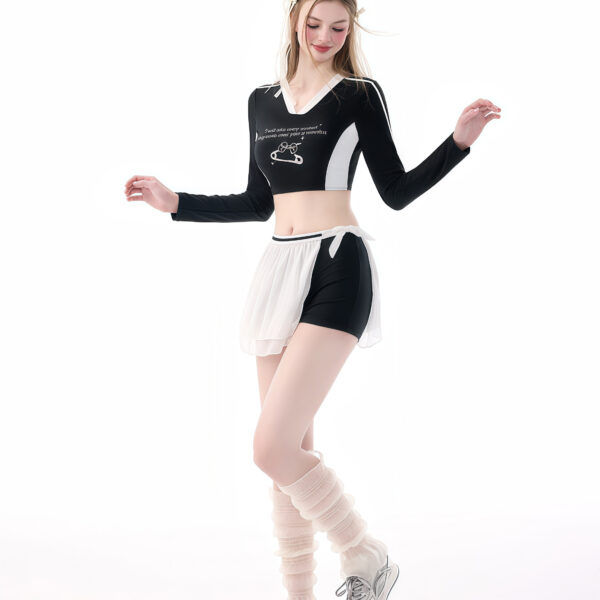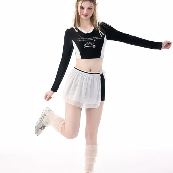 This black and white sporty two-piece set is perfect for anyone looking for an active yet stylish look. The cropped top features a fun graphic print, adding personality to the clean black and white design. The matching shorts offer a comfortable, sporty fit, making this set perfect for everything from casual outings to active beach days. Paired with knee-high socks and sneakers, this outfit brings a fun, youthful vibe that combines fashion and comfort.
