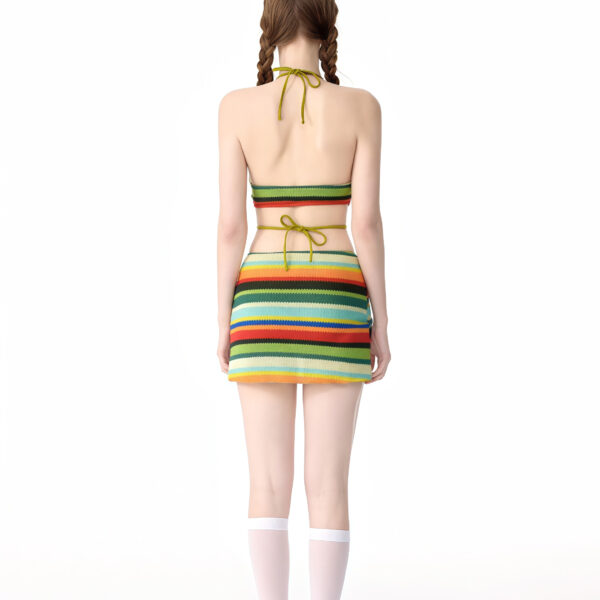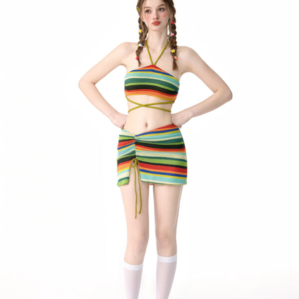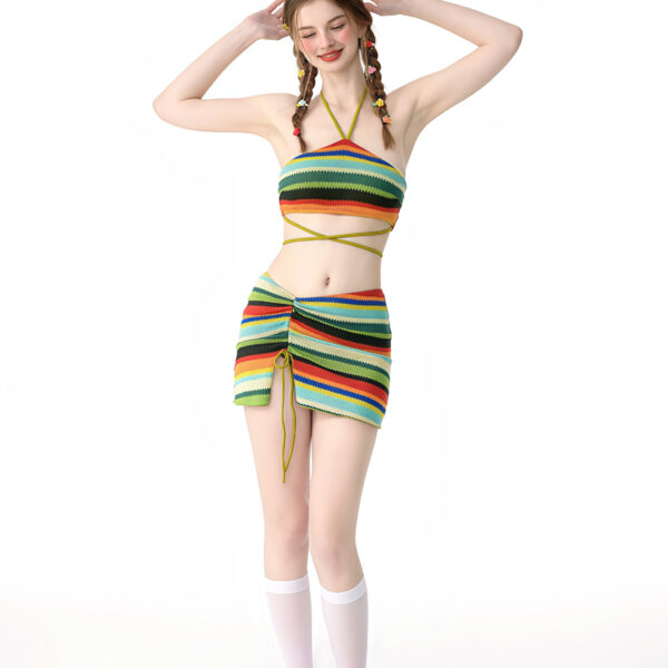 The striped pattern in bold colors like red, green, and yellow adds a lively touch to this swimsuit set. The halter neckline and crossed straps provide a trendy silhouette, while the matching skirt is designed to complement the top and give you a coordinated, chic beach look. This set is perfect for making a statement at the beach.