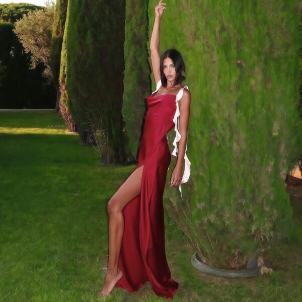 Step into elegance with this captivating women’s red maxi dress, featuring a deep side slit and delicate ruffle accents. Perfect for formal events, galas, or romantic evenings, this red slit maxi dress for women combines bold sophistication with graceful movement, making it a standout choice for 2025 fashion trends.