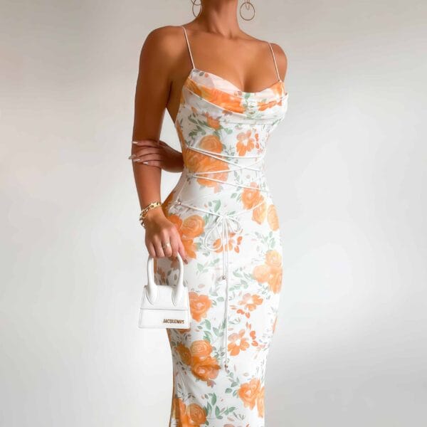 Crafted from lightweight, breathable fabric, this dress offers a form-fitting bodice that flatters your silhouette, paired with delicate spaghetti straps for a touch of elegance. The floor-length design flows gracefully, creating a seamless and chic look ideal for any occasion. The vibrant orange flowers with green accents add a fresh, summery vibe, ensuring you stand out with every step.