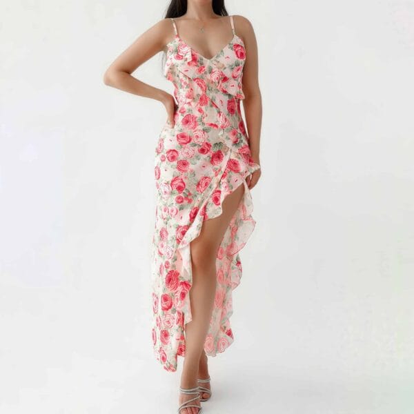 Crafted from lightweight, breathable fabric, this dress features a form-fitting bodice that flatters your figure, paired with delicate spaghetti straps for a touch of elegance. The standout asymmetrical ruffled hemline adds a playful yet sophisticated flair, while the vibrant pink rose floral print brings a romantic and feminine vibe. The floor-length silhouette flows gracefully, perfect for dancing the night away.