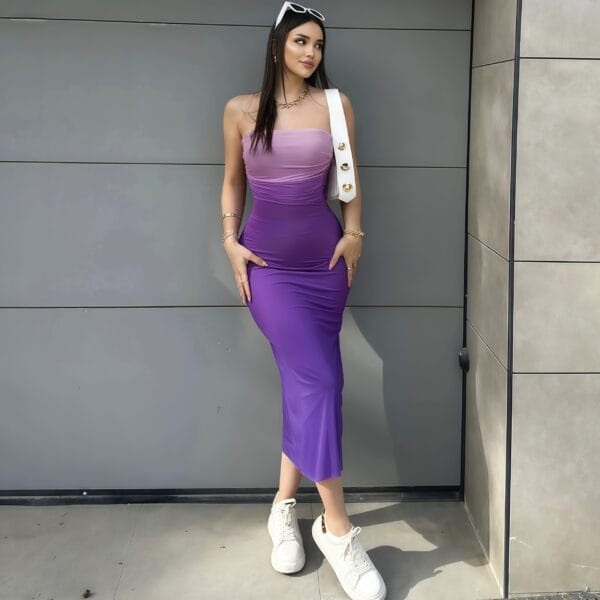 Step into elegance with our Women’s Strapless Gradient Midi Dress, a stunning piece that blends soft pink to rich purple in a seamless ombre effect. Crafted from stretchy, high-quality fabric, this form-fitting midi dress offers a sleek silhouette and all-day comfort, making it perfect for parties, dinners, or special occasions.