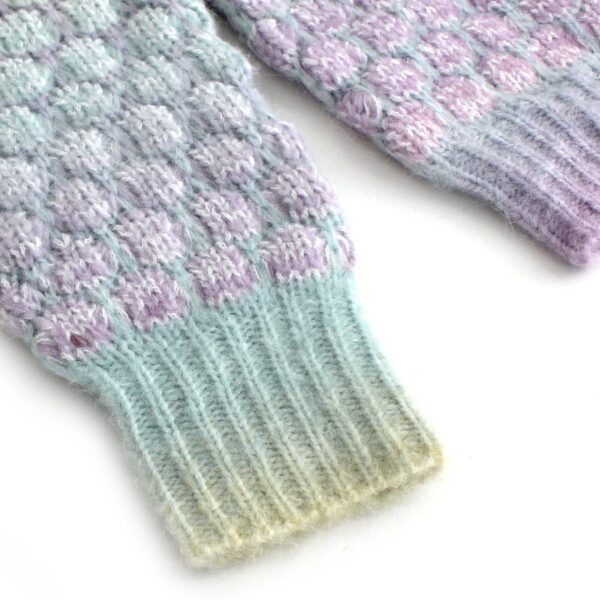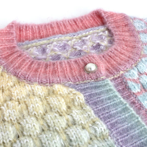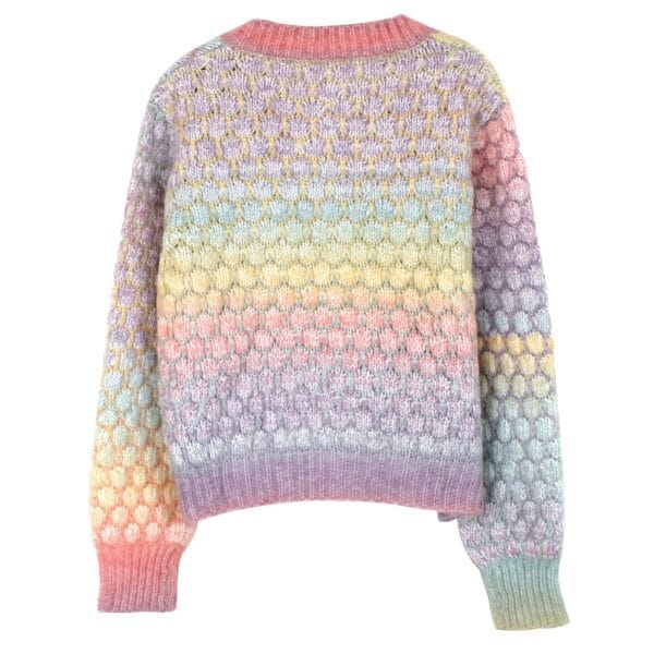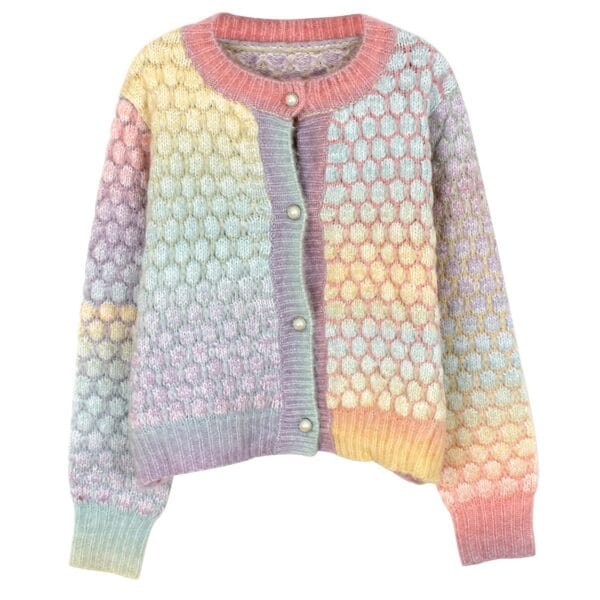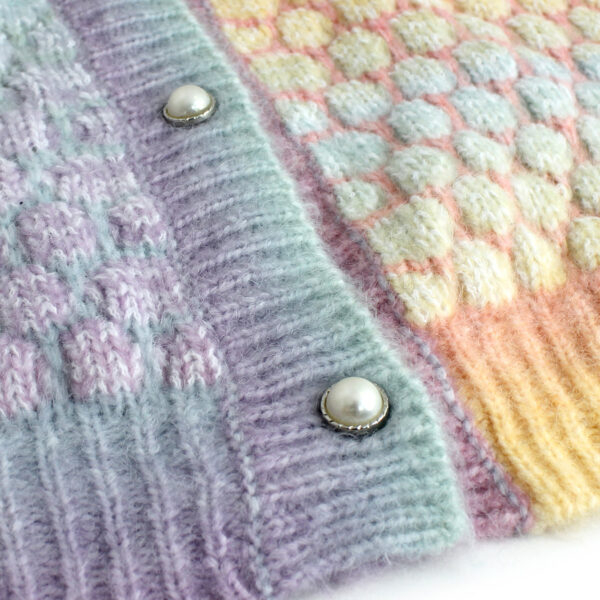 - Design: Showcases a unique multicolor gradient with a textured honeycomb knit and elegant pearl button details.