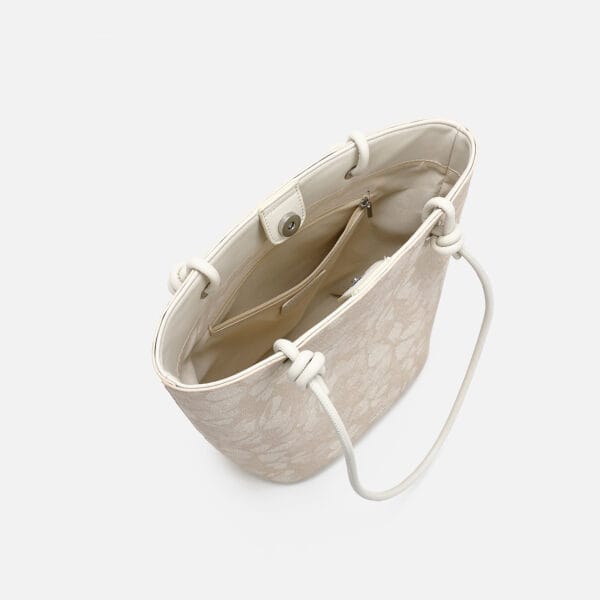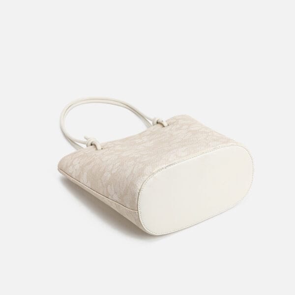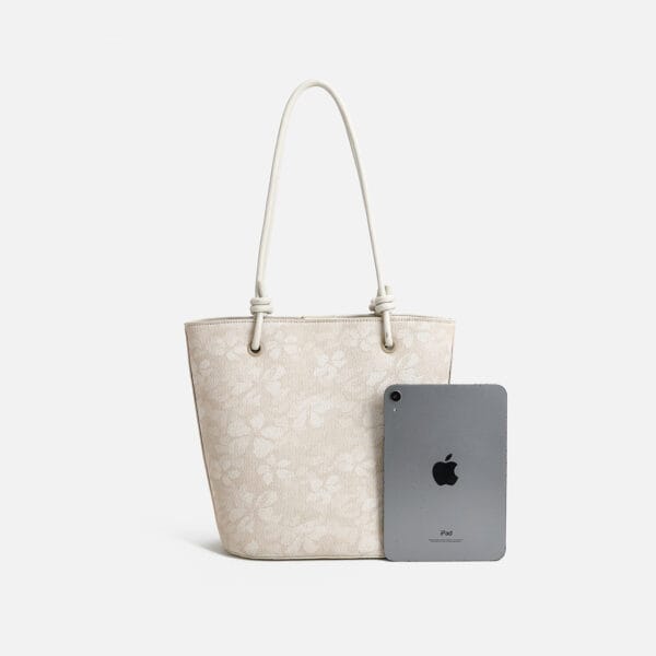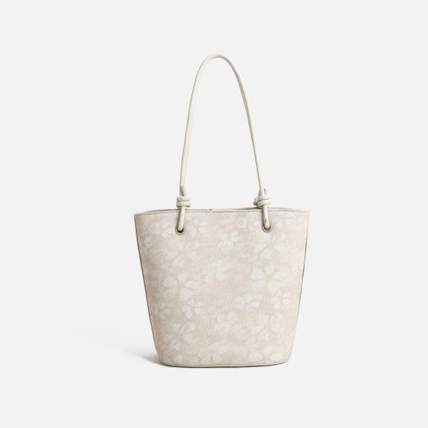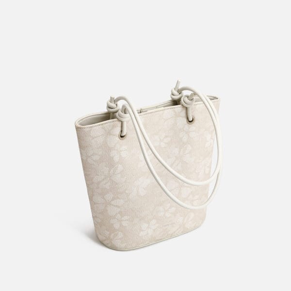 Embrace timeless style with this elegant off-white tote bag, a perfect blend of sophistication and charm. Adorned with a delicate floral pattern and a cute flower charm pendant, this women’s shoulder tote adds a fresh, feminine touch to any ensemble. Ideal for daily use or special occasions, the off-white leather tote features knotted handles and a spacious design for all your essentials.