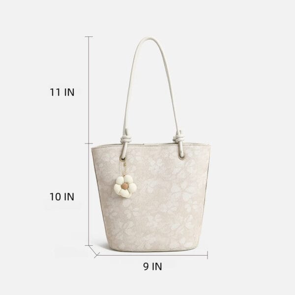 - Stylish Design: The floral-printed tote bag showcases a subtle yet striking pattern, complemented by a detachable flower charm, making it a trendy floral fashion bag.