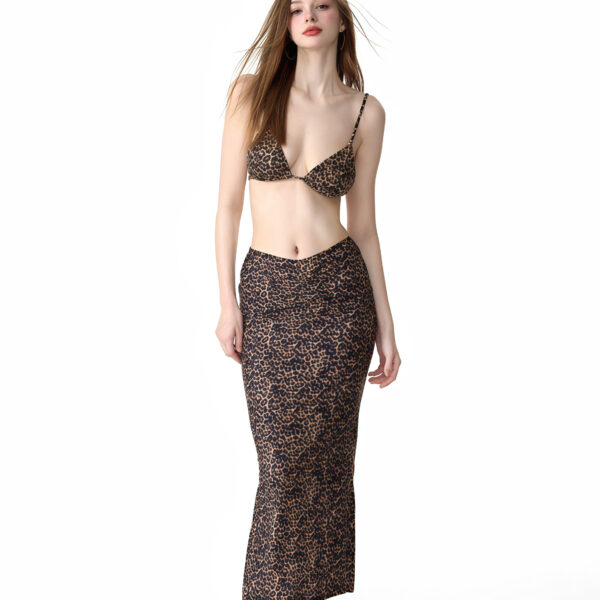 El emparejamiento falda con estampado de leopardo es el complemento perfecto para la parte superior del bikini. El diseño de cintura alta favorece la silueta y proporciona una cobertura adicional, al tiempo que mantiene un aspecto elegante. La silueta fluida y ligeramente acampanada confiere a la falda un aire relajado y playero, ideal tanto para descansar como para pasear por la orilla. El estampado de leopardo garantiza la cohesión y el atractivo del conjunto.