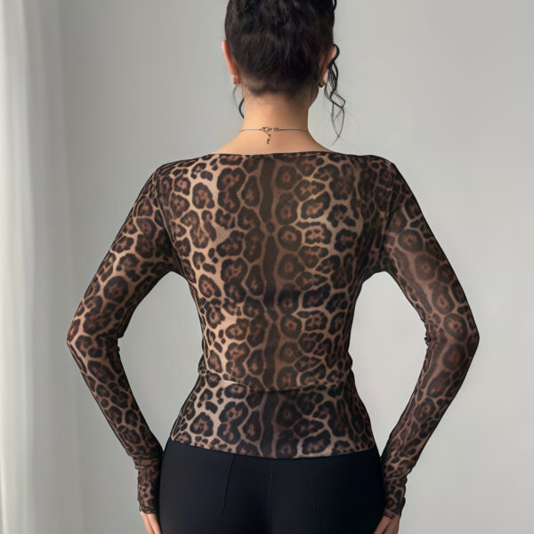 Este top de mujer con estampado de leopardo combina un diseño atrevido con la comodidad del día a día, convirtiéndolo en un complemento destacado para tu vestuario informal o para salir por la noche. El material de malla transparente añade un toque de encanto, mientras que el tejido duradero garantiza un uso duradero. Tanto si buscas un top de malla a la moda, una blusa de manga larga con estilo o una opción versátil para vestir a capas, esta prenda te lo ofrece.