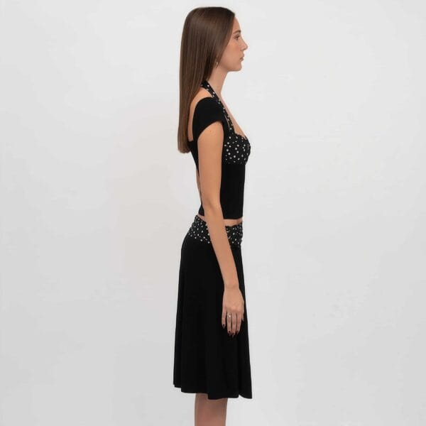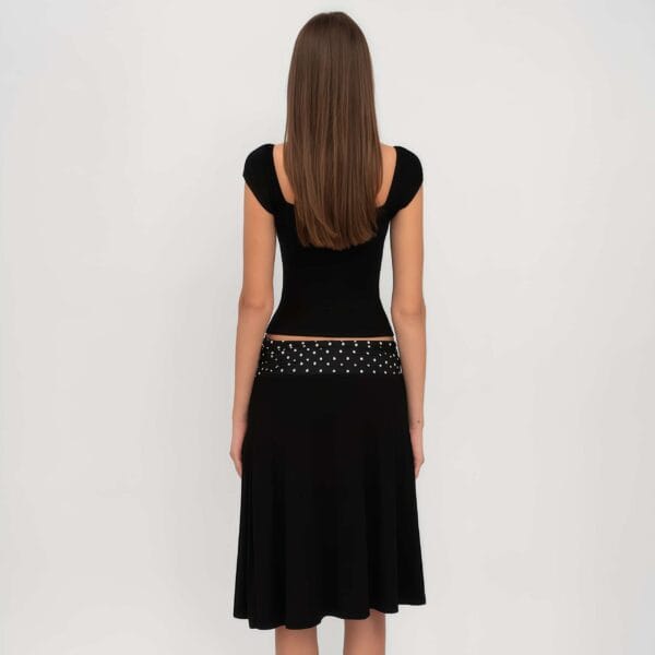 - Diseño: La vestido cuello halter luce un llamativo estampado de lunares en la parte superior, combinado con una elegante falda midi negra. La cintura entallada acentúa tus curvas, mientras que la falda midi fluida añade un movimiento elegante.