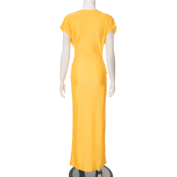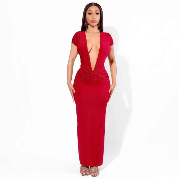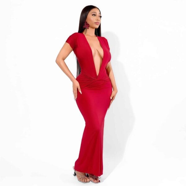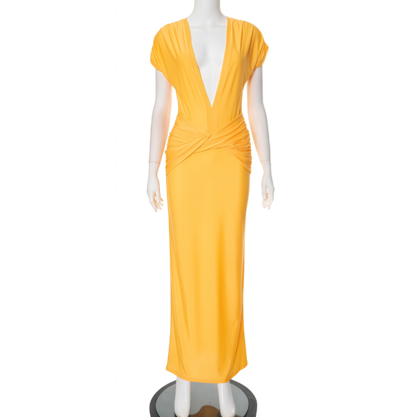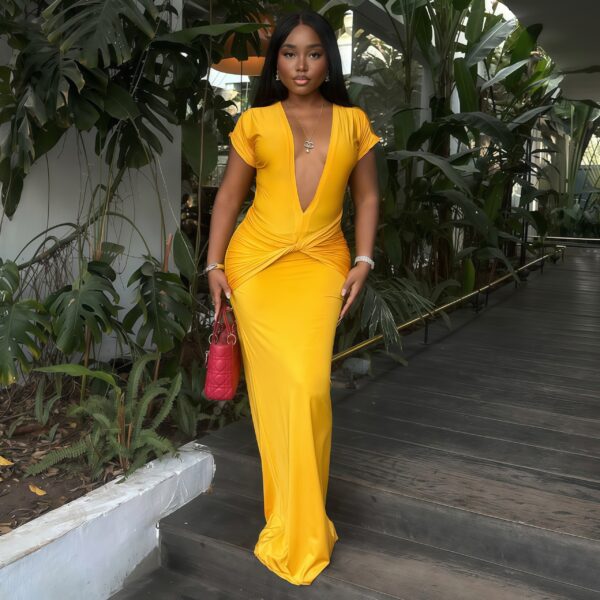 Nosta tyyliäsi meidän Naisten Plunge Neck Maxi Mekko, upea yhdistelmä eleganssia ja rohkeutta, saatavana seuraavissa väreissä elinvoimainen kulta ja rikas punainen. Tämä lattianmyötäinen maksimekko sisältää syvä pääntie ja tyylikkäästi drapattu twist knot -muotoilu, joten se sopii täydellisesti iltatilaisuuksiin, juhliin tai virallisiin tilaisuuksiin. The vartalonmyötäinen istuvuus ja lyhyet hihat lisäävät tyylikkään kosketuksen tähän pitkä elegantti puku.