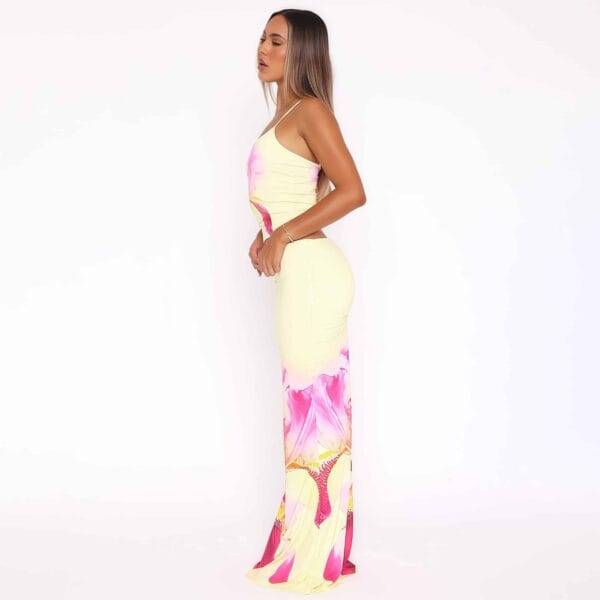 - Suunnittelu: V-kaula-aukko ja röyhelöhihat korostavat naisellista siluettia, kun taas midi-hame, jossa on pieni levennys, antaa siroa, virtaavaa ääriviivaa. Eloisa printti tuo boheemia charmia, mikä tekee siitä erottuvan rennon vaatteen.
