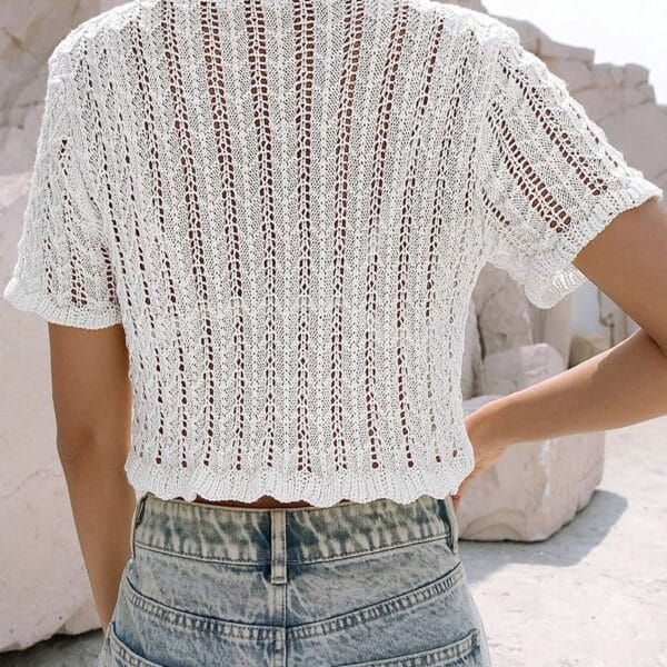 Paranna kesävaatekaappiasi tällä tyylikkäällä naisten valkoinen virkattu crop-toppi, täydellinen boheemiin tyylikkääseen lookkiin. Valmistettu kevyestä puuvillasekoite, tämä kesän crop top naisille tarjoaa hengittävän, ilmavan tuntuman, joka sopii lämpimään säähän. ... V-kaula-aukkoinen malli kanssa solmio edessä yksityiskohta ja lyhyet hihat, joiden reunat ovat scalloped-reunat lisää naisellisuutta, kun taas leikattu pituus sopii vaivattomasti korkeavyötäröisten farkkujen tai hameiden kanssa. Tämä valkoinen virkattu toppi on monipuolinen kappale rantaretkille tai rentoihin päiviin.