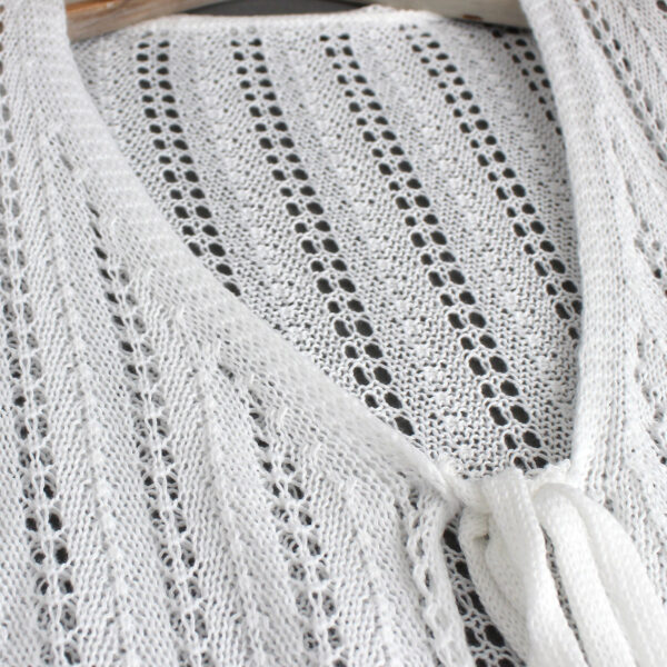 - Suunnittelu: Ominaisuudet V-pääntie solmiolla, kampamaiset lyhyet hihatja monimutkainen virkkausmalli trendikkääseen tunnelmaan.