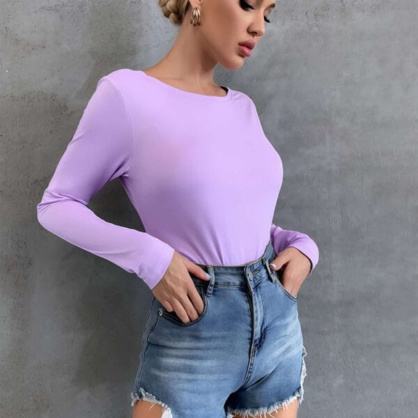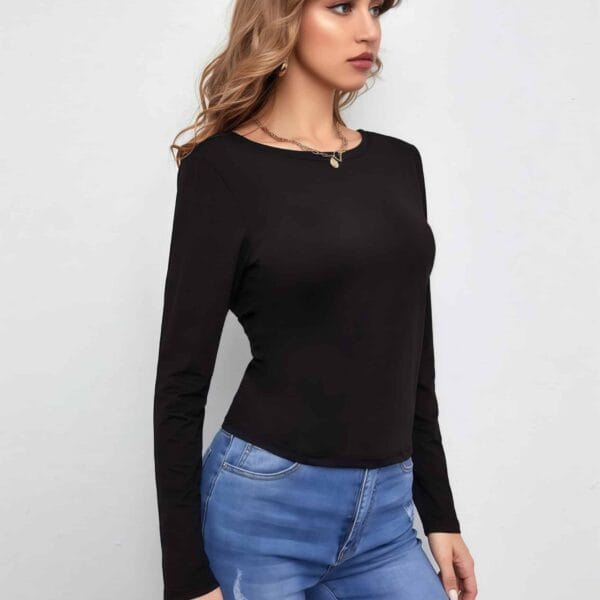 Nosta jokapäiväistä tyyliäsi tällä tyylikkäällä naisten musta avonainen yläosa, täydellinen sekoitus eleganssia ja modernia tunnelmaa. Valmistettu pehmeästä ja joustavasta polyesteri-spandex-sekoitus, tämä pitkähihainen toppi naisille tarjoaa mukavan istuvuuden, joka imartelee vartaloasi. Erottuva avoimen selkämyksen muotoilu tyylikkäällä solmion yksityiskohta lisää viehättävyyttä, joten se sopii erinomaisesti rentoihin retkiin tai iltapukeutumiseen. Yhdistä se farkkujen tai hameiden kanssa monipuolisen ja tyylikkään lookin luomiseen.