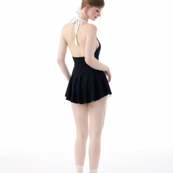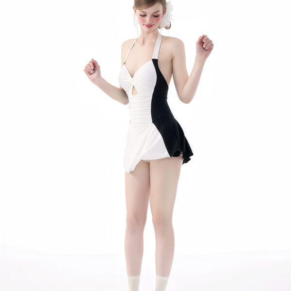 Valkoinen ja musta Halter-uimamekko, jossa on leikkaus yksityiskohtia
