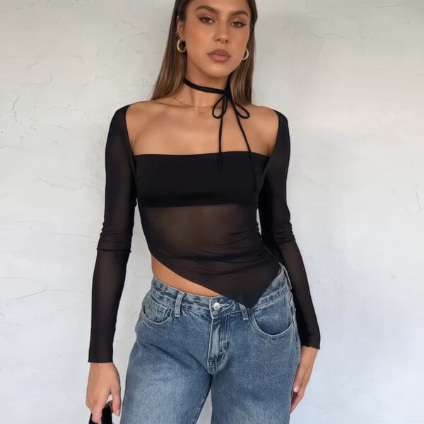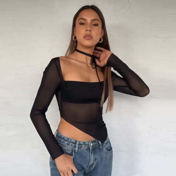 Pourquoi choisir ce débardeur à manches longues en maille transparente ?