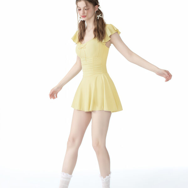 Joli maillot de bain jaune à jupe avec détail de cravate sur le devant