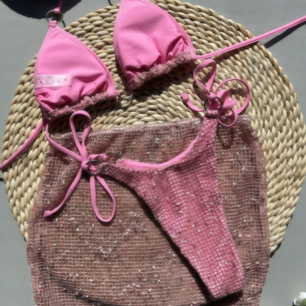 Améliorez votre garde-robe de plage avec cette Ensemble trois pièces à paillettes rosesidéal pour les amoureux de la plage en été et les amateurs de vacances de luxe. Magasinez maintenant pour l'ultime maillots de bain à paillettes pour femmes et brillez cette saison !
