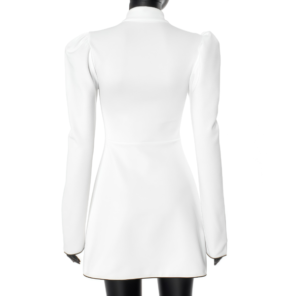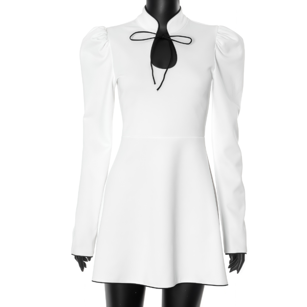- Design: Maniche lunghe a sbuffo, scollatura alta con accenti di cravatta nera e vestibilità sartoriale per un outfit chic e sofisticato.