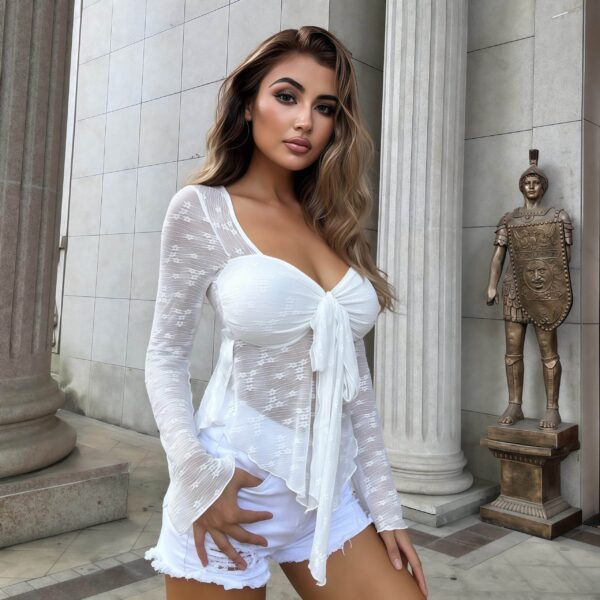 Realizzato in un materiale leggero misto chiffon con accenti di pizzo, questo crop top a maniche lunghe è caratterizzato da un tessuto velato e traspirante che si sente morbido e arioso sulla pelle. I delicati dettagli in pizzo sulle maniche aggiungono un tocco di femminilità, mentre la leggera elasticità assicura una vestibilità comoda e confortevole. Ideale per la stagione calda, questo camicetta trasparente mantiene il sangue freddo e aggiunge un tocco di raffinatezza al vostro look.