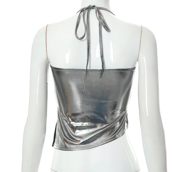 Elevate your fashion game with this stunning silver metallic halterneck crop top. This sleeveless blouse features a shiny, reflective fabric that adds a glamorous touch to any outfit. Perfect for trendy fashion lovers, this modern crop top is designed with an elegant neckline and adjustable ties at the back for a comfortable, customizable fit.