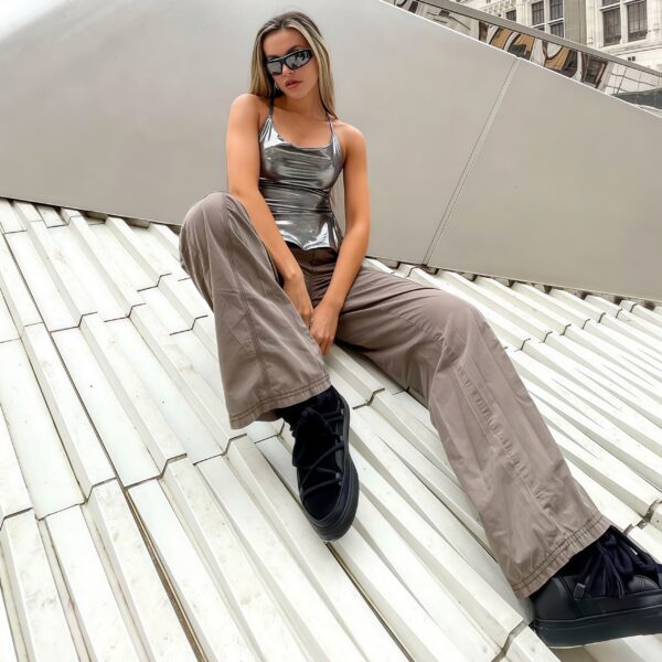 Crafted from high-quality metallic material, this chic silver top offers a sleek, couture-inspired look. The reflective surface catches the light, making it a standout piece for runway displays or casual chic ensembles. Its fashionable cut and glamorous appeal make it a versatile addition to any trendy wardrobe.