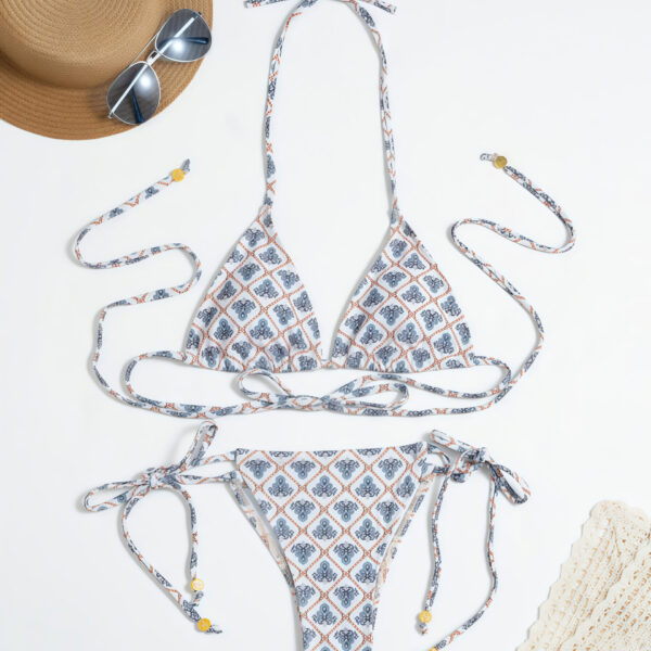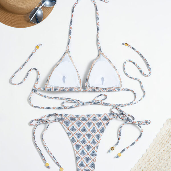 Eleve a sua coleção de roupa de praia com este deslumbrante conjunto de biquíni para mulher, com um design chique com atilhos e uma versátil parte de cima com halteres. Concebido para a moderna banhista, este conjunto de fatos de banho combina moda e funcionalidade, sendo perfeito para apanhar sol, nadar ou para umas férias tropicais. O padrão apelativo apresenta um estampado geométrico único em tons suaves de azul e laranja, sobre um fundo branco nítido, o que o torna uma escolha de destaque para a moda de verão.
