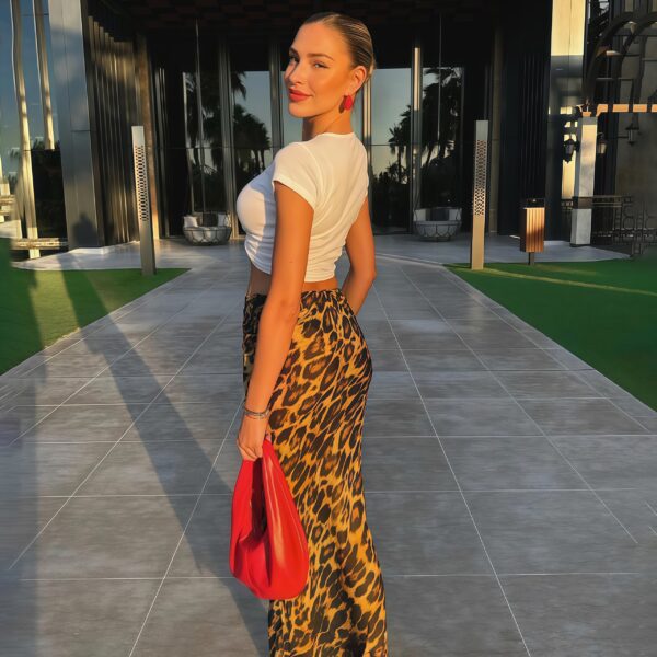 Detta omlottkjol med leopardmönster kombinerar djärvt djurmönster med mångsidig styling, vilket gör den till ett perfekt val för en brun beige svart kjol, stretchig omlottkjol i leopard, eller elegant avslappnad nattklädsel. De justerbara knytbanden ger en skräddarsydd passform och det stretchiga tyget gör att du kan röra dig fritt. Kombinera den med en enfärgad topp eller klackar för en effektfull look.
