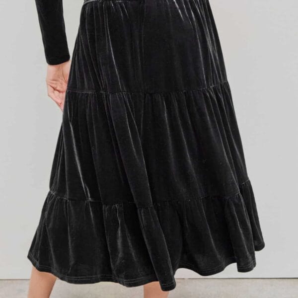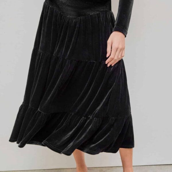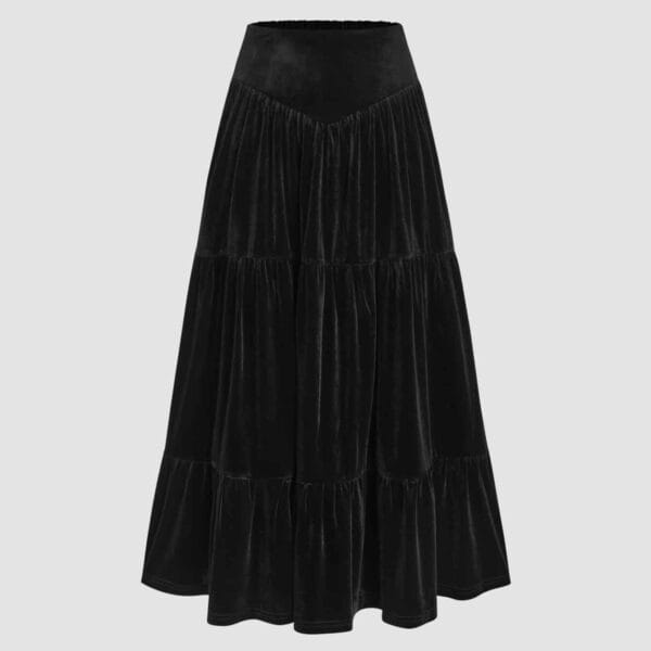 Detta svart sammet midikjol för kvinnor kombinerar elegans och mångsidighet med sin mjukt sammetsmaterial och sofistikerad design. Den skiktade lager ger volym och rörelse, medan elastisk midja ger komfort hela dagen. Perfekt för dig som söker en lyxig midikjol, sammetskjol för kvinnoreller en snygg kjol i lagerär detta plagg ett måste. Kombinera den med en blus eller tröja för en elegant look.